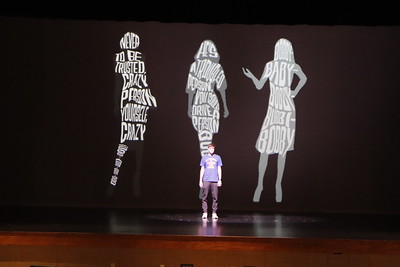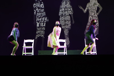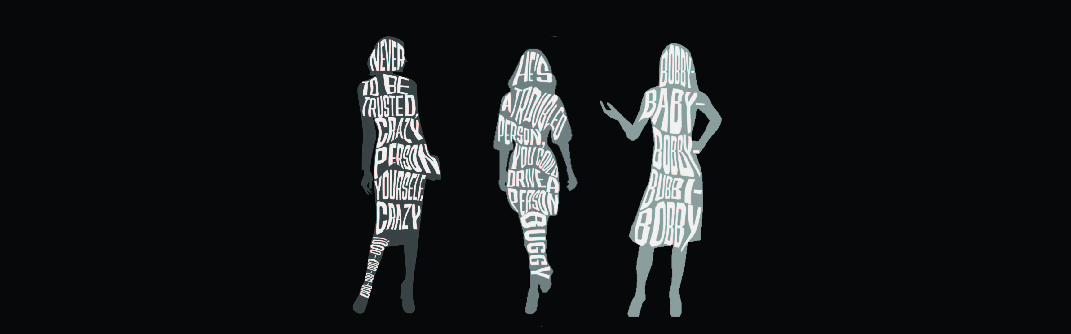 The song ‘Drive a Person Crazy’ from the musical Company was performed with four actors, one only appearing for a couple seconds leaving three girls and a couple of chairs on stage. I used words from the song to create a typography. I got images of three women, created silhouettes of them and then filled the silhouettes with words. The “doo-do-do-doo” repeated in the chorus and became a line I could hear all the time. A key reason why I had one person completely filled with that. I chose black and white because they stood out from the colorful lighting of the song. I wanted the image to almost dissolve into the background and have the bright pink lights highlight the girls in the front. I believe I accomplished this. If given the option I would not change the background because I believe that it completed the composition and highlighted the stars of the show.
