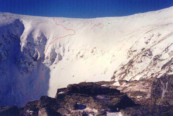 JR's route from the rim of Tuckerman's Ravine down the Chute (about 1000 vertical feet between 45 and 55 degree pitch)