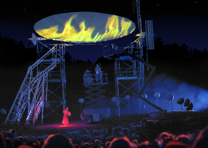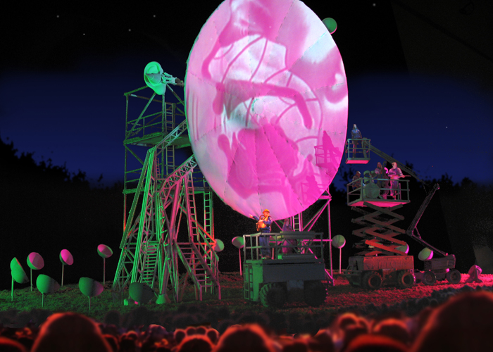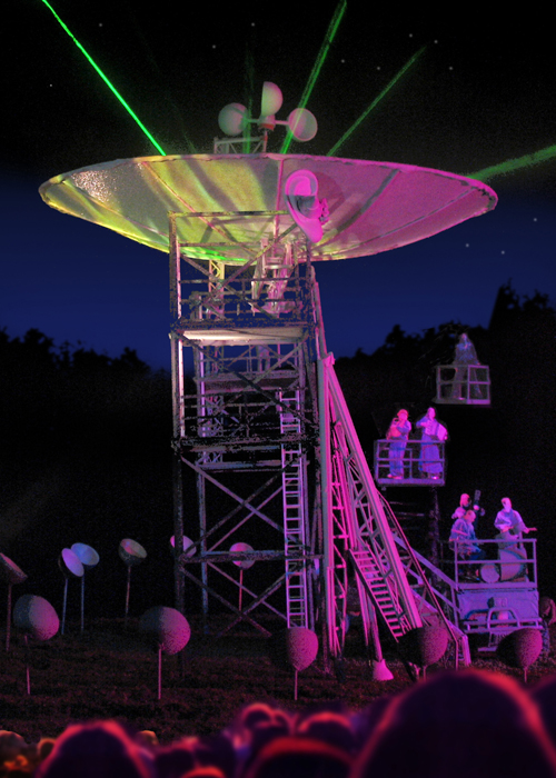 Astro-rama will be a free, large-scale outdoor event joining its audience in a festive attempt to contact far-flung galaxies. We will build a 40ı radio telescope dish mounted to two scaffold towers, tuned to the galactic frequency of B-flat. The performers will rise in scissor lift platforms, and movies and lasers will energize the show. We will compose a proud message from our species, power up, tilt the dish towards 51 Pegasus, and transmit. Astro-rama will be a one-week series of evening celebrations of both our regionıs and our speciesı progress, at Carnegie Science Center. This will enhance our 250th celebration with an inventive and accessible new work, created locally, and will extend Squonkıs capabilities with its scale and setting, and develop our regional connections.