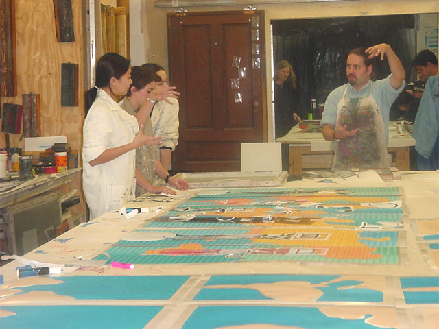Students and teacher Jon Clemmer make decisions about the placement of symbols on the print.