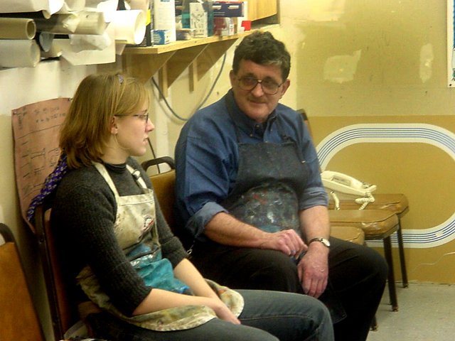 | A senior student discusses the project with resident artist Ian Short, retired Chair of the Edinboro University Art Department. | |||||||||||