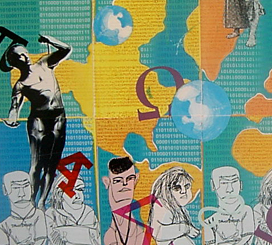 First Artists Image Resource work session to produce studies for the Troika Ranch project. Home|Theme Scenarios|Stage Design|Theme Images|Troika Ranch|AIR Students from North Allegheny Senior and Intermediate High Schools worked at Artists Image Resource on large screen prints that used many drawings, photographs, paintings, collages and other graphic elements to express our theme. The prints are prototype studies for a 12'X36' print that will be part of the stage set. We will also be producing an edition of prints to promote the event. These prints will be part of an exhibit that will accompany the performance and an exhibit at the AIR Galleries. Video Clips of work on the prints Click below for larger images | |||||||||||